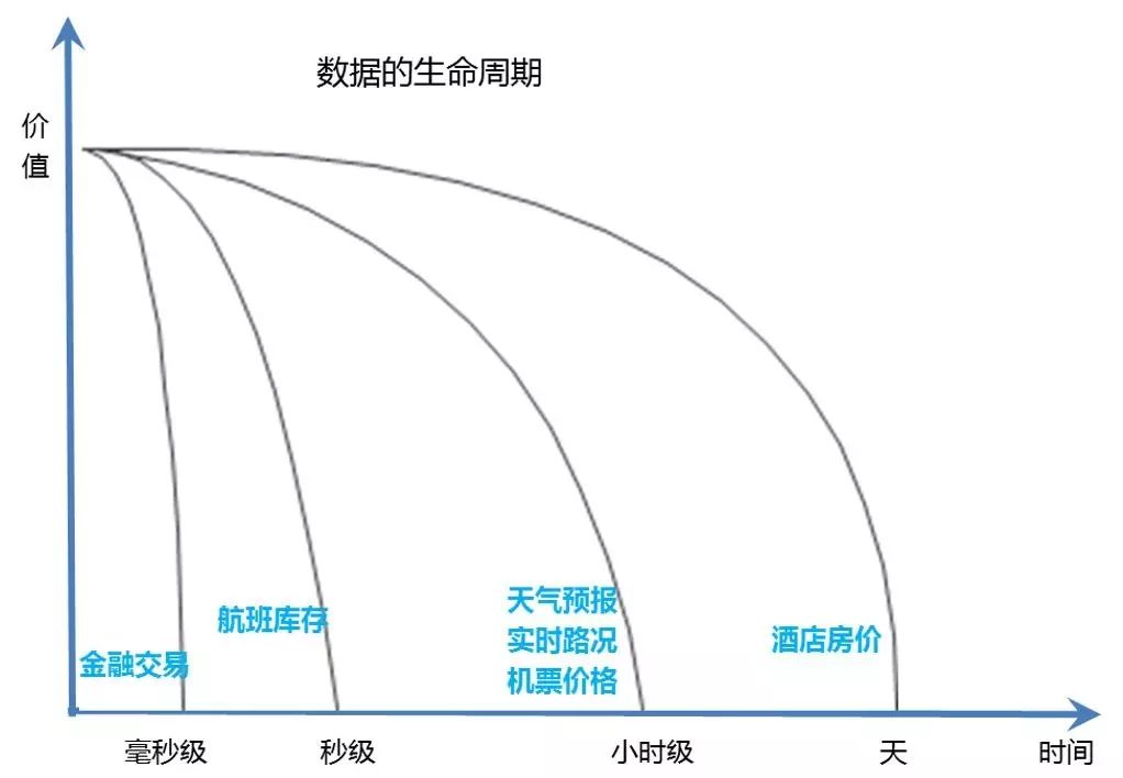 如下图所示:金融交易类的数据,其价值以毫秒计算,如股指期货的指数数据,其价值瞬间就耗散,几分钟之前的股指数据几乎没有任何价值。航班的库存(剩余座位)信息,随着机票销售的进行,剩余数量在不断变化中,可能20秒之前的剩余座位数据对现在已经不具备参考意义。天气预报、实时路况和机票价格数据,其有效时间可能会稍长一些,以小时计算。2、3个小时之前的路况拥堵信息,已经不能作为人们出行的参考依据了。还有一些数据有效性可能会更长一些,比如商品房的售价,汽车的零售价,商家报给消费者的价格,有效期会是几天的时间。