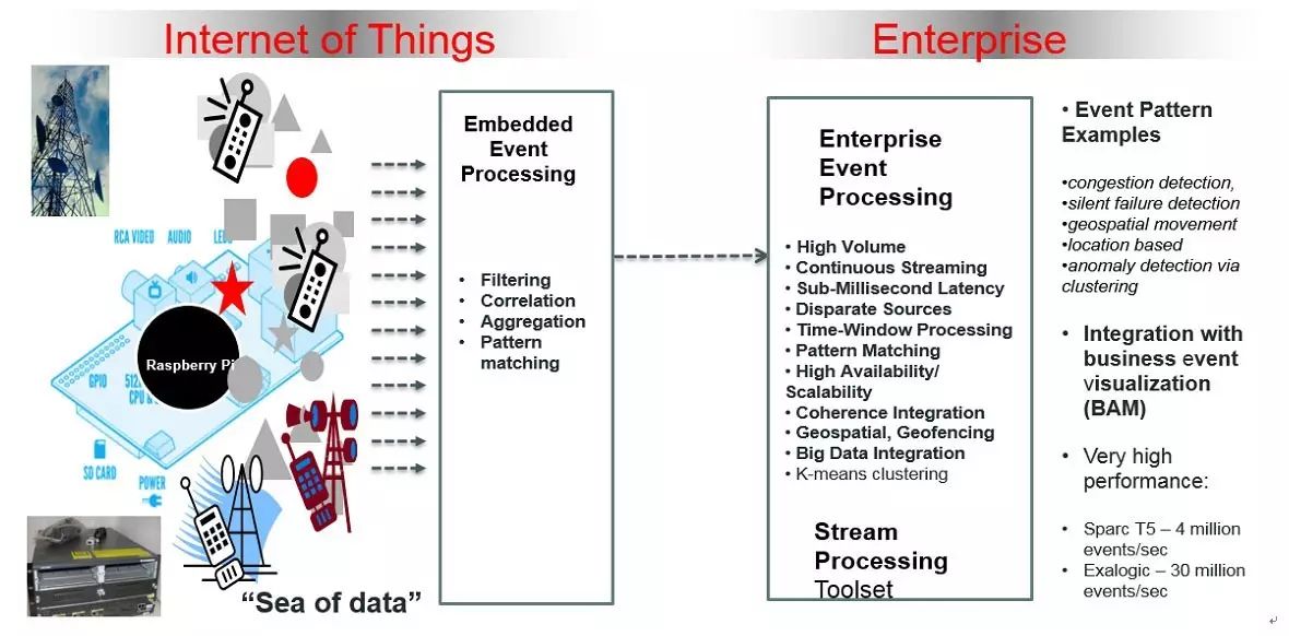 强大的集成能力,可集成AQ, JMS , HTTP Publish/Subscribe, SOA Suite, 数据库,Oracle Spatial, Coherence, BAM, ESB, BPM, MQTT,Apache Kafka,Twitter等。