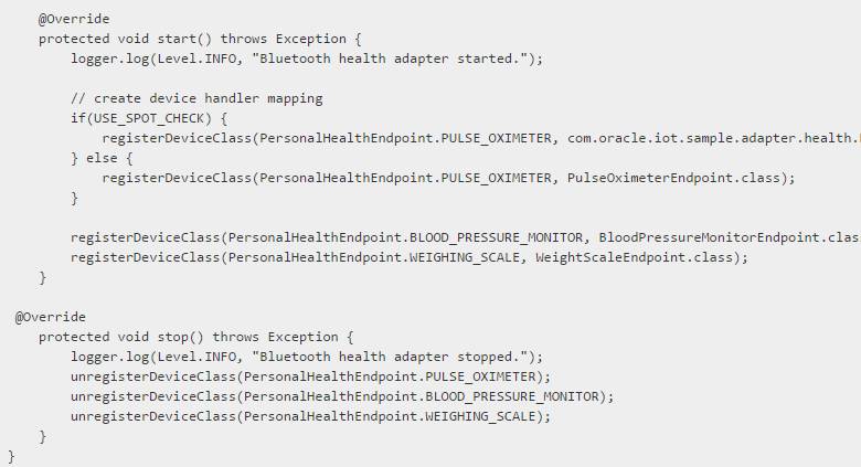 接着添加用于发现具有蓝牙健康设备类型的物理设备的代码,并将其注册到Oracle IoT Cloud Service平台。