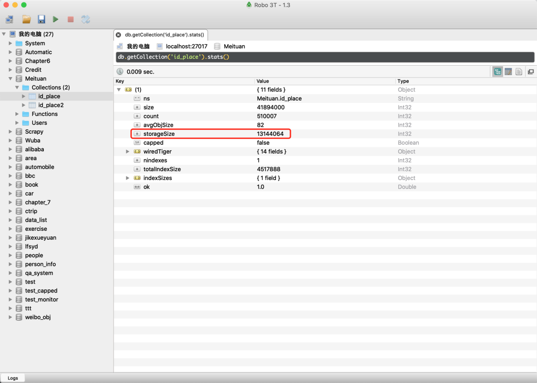 就是这个集合在硬盘中占用的空间,单位是 Byte。且不说人眼难以区分13144064 Byte到底是130MB 还是1.3GB。光说这个 MongoDB 里面不同数据库总计有上百个集合,我们应该如何查询?