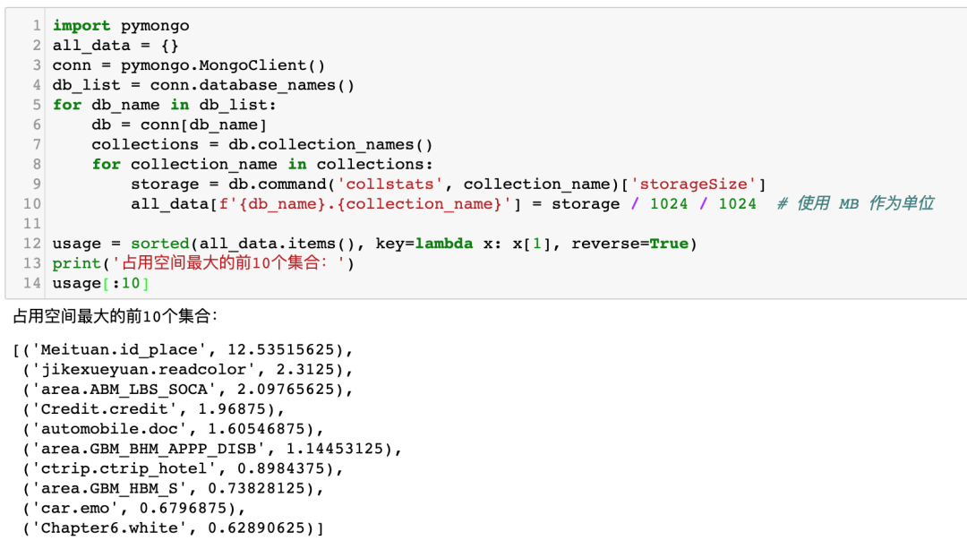 我的 MongoDB 上面有很多库,每个库里面有很多集合。他们占用了太多的储存空间。现在我想找到占用空间最大的10个集合,应该如何操作?