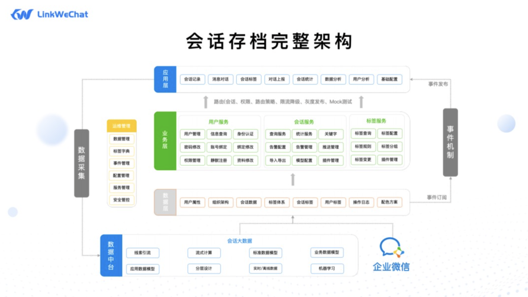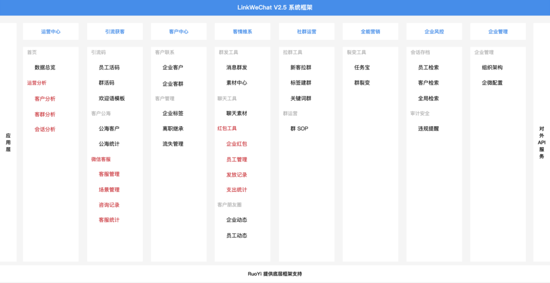 com.linkwechat├── common // 工具类│ └── annotation // 自定义注解│ └── config // 全局配置│ └── constant // 通用常量│ └── core // 核心控制│ └── enums // 通用枚举│ └── exception // 通用异常│ └── filter // 过滤器处理│ └── utils // 通用类处理├── framework // 框架核心│ └── aspectj // 注解实现│ └── config // 系统配置│ └── datasource // 数据权限│ └── interceptor // 拦截器│ └── manager // 异步处理│ └── security // 权限控制│ └── web // 前端控制├── linkwe-generator // 代码生成├── linkwe-quartz // 定时任务├── linkwe-system // 系统代码├── linkwe-admin // 后台服务├── linkwe-ui // 页面前端代码├── linkwe--wecom // 企业微信功能