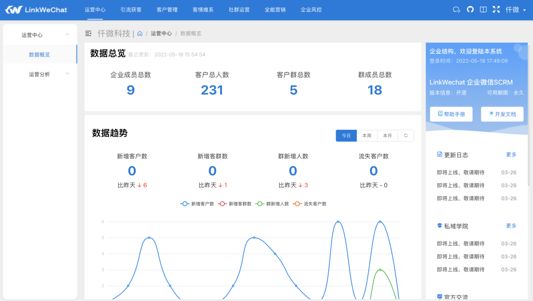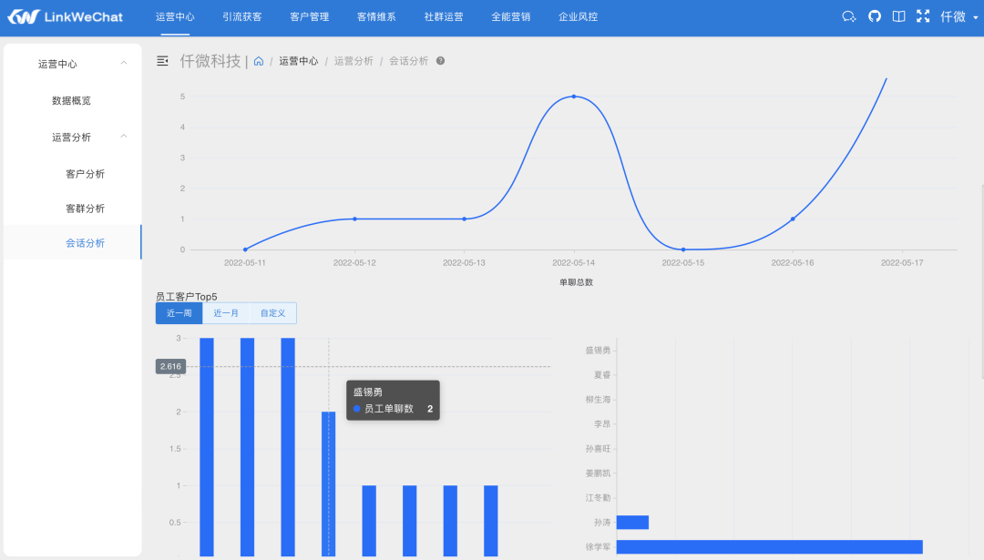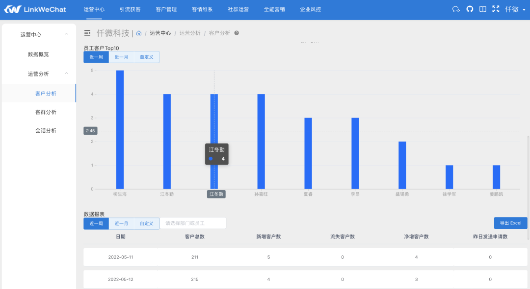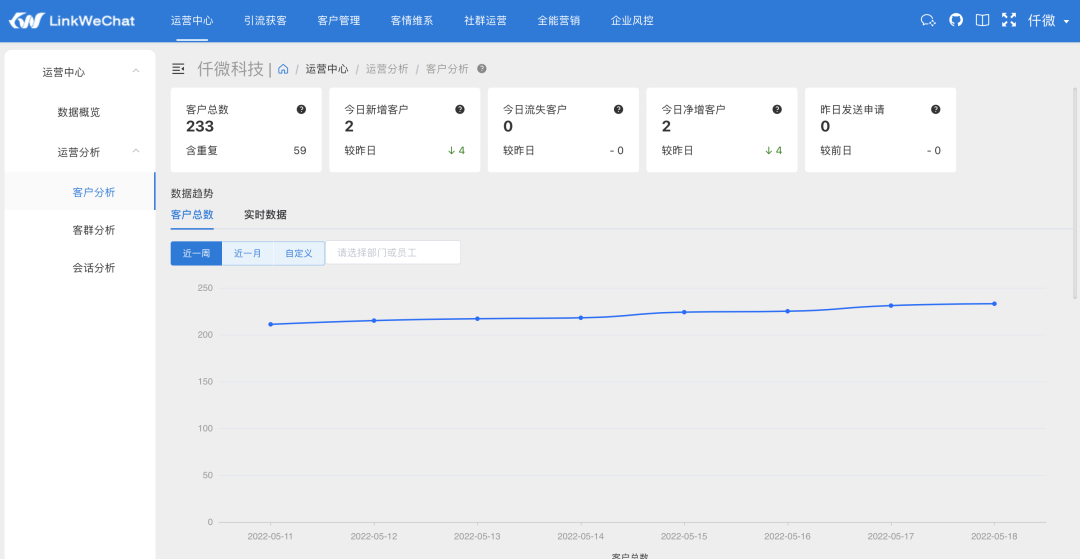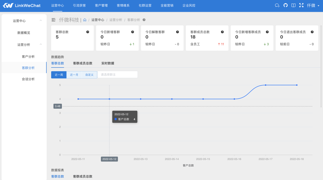 运营中心 :客户、客群、会话等全功能数据报表,数据一目了然;