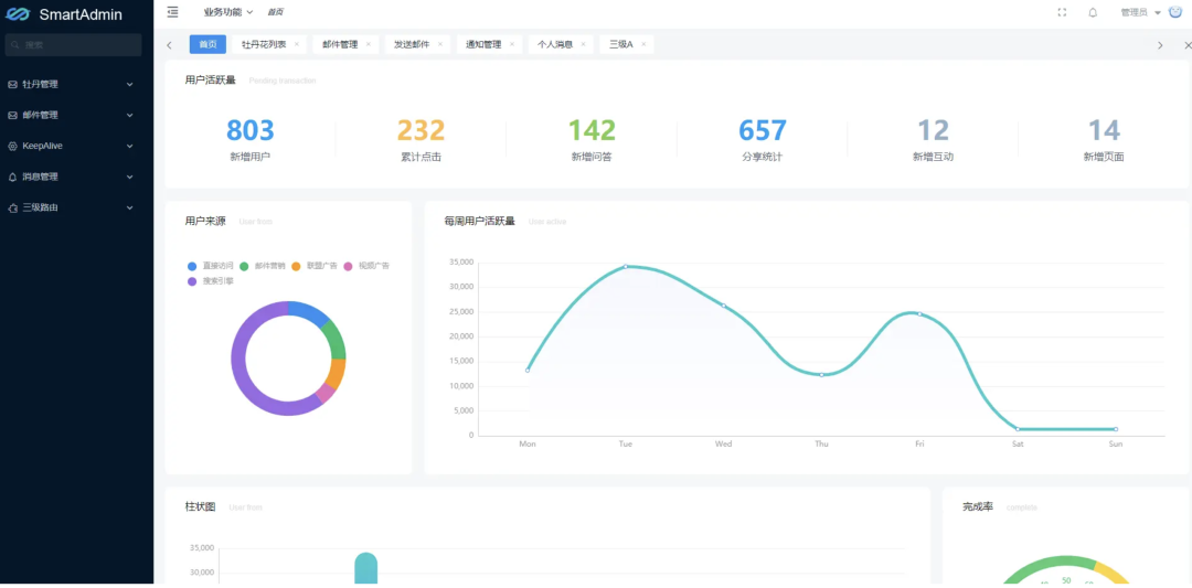 高质量的代码、代码结构、和代码注释;漂亮的UI,菜单栏、标签页,体验、交互更好用的员工、部门、角色、菜单管理等等;优化基于Keepalive的标签页,做到标签页该缓存的时候缓存,比如左右切换等,不该缓存的时候不缓存,比如新建,表单提交结束等;前端常量维护: vue-enum,拒绝出现魔法数字,代码不可维护的现象;全新的基于前端的权限设计(忘掉传统的权限设计吧,已经不适合这个前端时代);基于websocket的在线人数;支持一级、二级、三级菜单,四级菜单以及搜索功能;其他功能:邮件、富文本、消息、系统配置等等。
