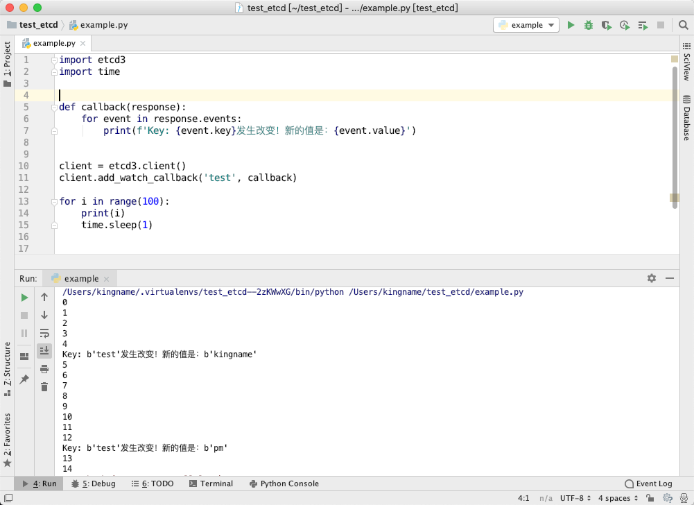 import etcd3import timedef callback(response):for event in response.events:print(f'Key: {event.key}发生改变!新的值是:{event.value}')client = etcd3.client()client.add_watch_callback('test', callback)for i in range(100):print(i)time.sleep(1)