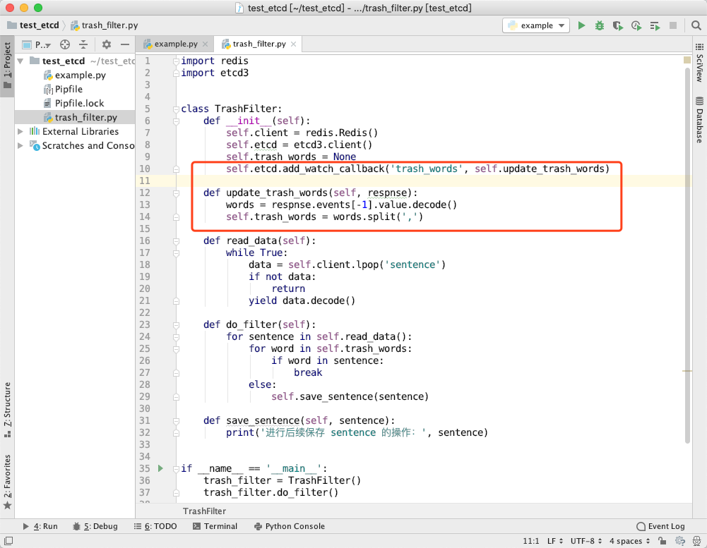 在上面的代码中,需要过滤的词是以列表的形式直接写到代码里面的。那么问题来了,如果这些过滤词是动态改变的怎么办?每次为了修改这些词,你都需要重启一下这个程序吗?