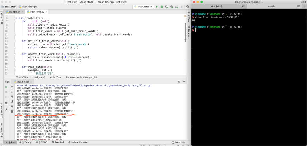字也不是过滤词。但是当我们在命令行里面更新了 etcd,把新的过滤词改成垃圾,脏
