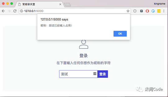 此时,无论输入任何昵称,一定会提示昵称已经被占用,无法进入聊天室页面。
