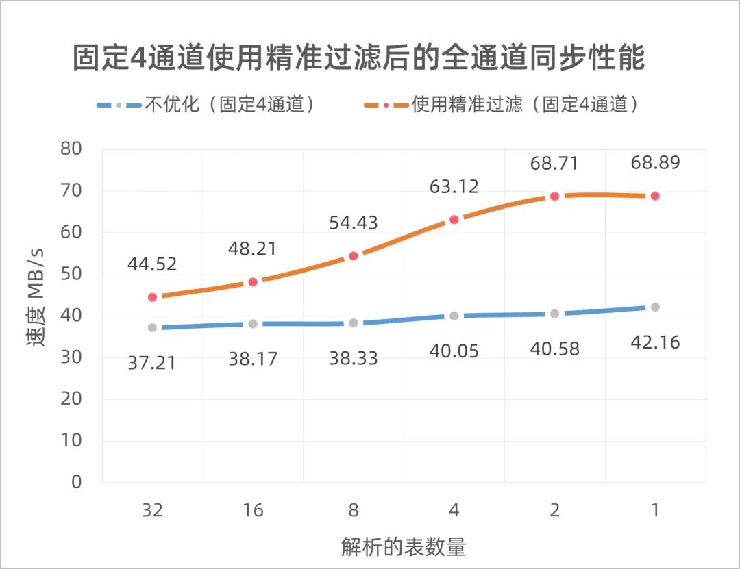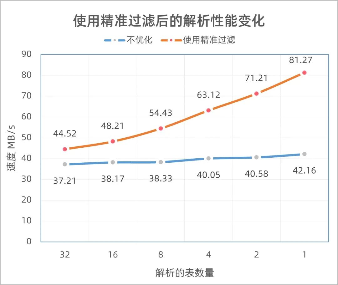 如图,同样的归档数量下。可以看到开启“精准过滤”后,解析的性能随着需要解析表数量的减少呈现比例式的增强。