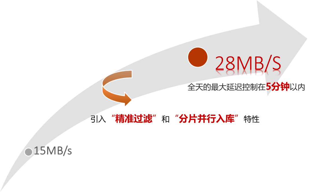 在引入了“精准过滤”和“分片并行入库”特性后,其整体平均同步性能从原来的15MB/s左右提升到了28MB/s左右。更重要的是,经过优化后,全天的最大延迟控制在了5分钟以内。