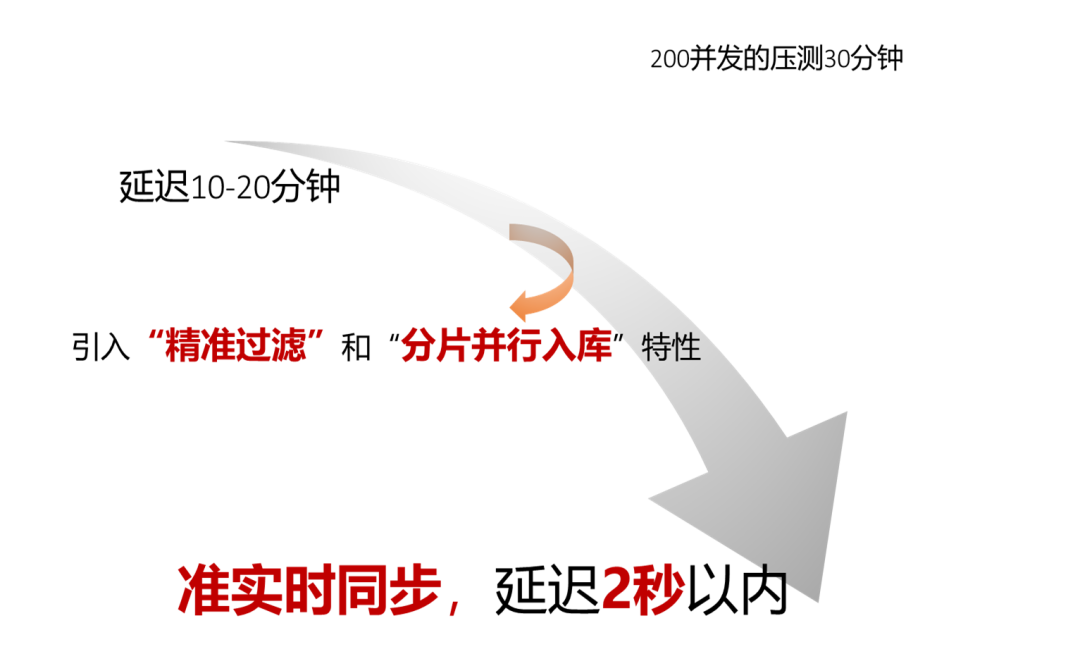 在引入了“精准过滤”和“分片并行入库”特性后,在200并发的压测场景中,整体同步性能指标从压测30分钟,延迟10-20分钟变为准实时同步,延迟2秒以内。