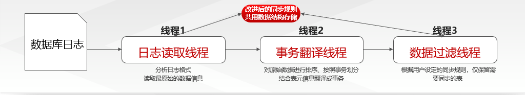 其中:过滤和转换规则对下层的线程1和线程2隔离。仅线程3知道用户设定的同步规则,由其基于用户设定的业务规则做数据过滤。即只有工人3才知道产品质检的规则。