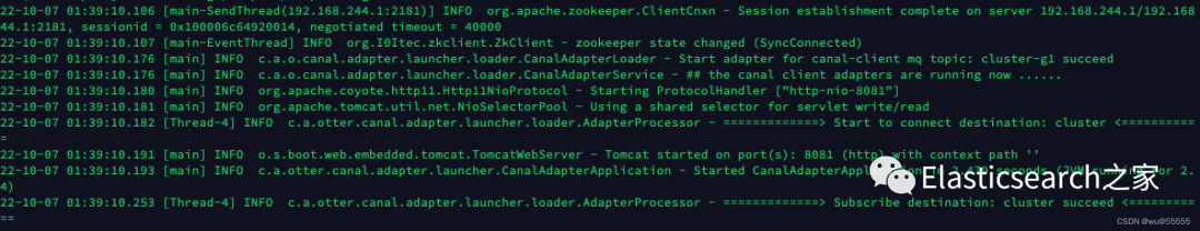 8、启动两个节点,需要注意的是,启动第二个节点的时候是不会启动成功的,如我们上述所说同时只会有一个canal服务运行,当另一个canal服务宕机时该备用节点会自动启动的