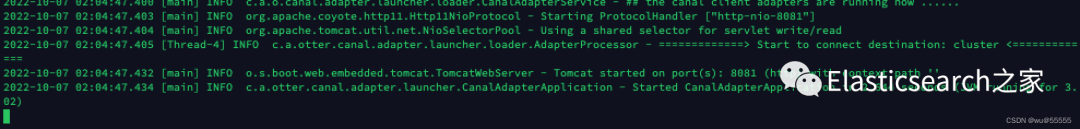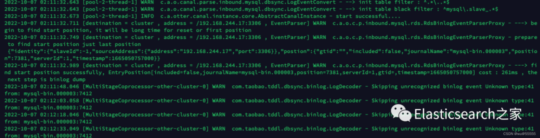 server:port: 8081spring:jackson:date-format: yyyy-MM-dd HH:mm:sstime-zone: GMT+8default-property-inclusion: non_nullcanal.conf:mode: tcp #tcp kafka rocketMQ rabbitMQflatMessage: true# zk地址【1】zookeeperHosts: 192.168.244.1:2181syncBatchSize: 1000# 出现报错时的重试次数retries: 0timeout:accessKey:secretKey:consumerProperties:# canal tcp consumer# deployer服务端地【2】# canal.tcp.server.host: 127.0.0.1:11111# zk地址【3】canal.tcp.zookeeper.hosts: 192.168.244.1:2181canal.tcp.batch.size: 500canal.tcp.username:canal.tcp.password:srcDataSources:# 源数据库地址,可配置多个canalDs: # 命名自定义【4】url: jdbc:mysql://192.168.244.17:3306/canal_test?useUnicode=trueusername: canalpassword: canalcanalAdapters:- instance: cluster # 服务端配置的实例名称【5】groups:- groupId: g1outerAdapters:# 开启日志打印- name: logger# 配置目标数据源【5】-key: es# es7 or es6name: es7hosts: http://192.168.244.11:9200 # 127.0.0.1:9300 for transport modeproperties:mode: rest # or rest or transport# es账号密码security.auth: elastic:elastic # only used for rest mode# es集群名称cluster.name: blade-cluster
