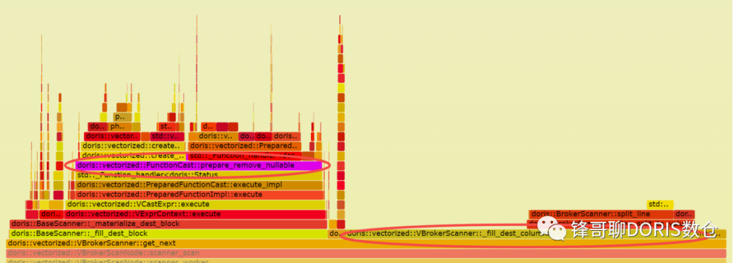 FlameGraph: 一旦通过Profile分析到大概的热点位置,笔者通常会快速通读一遍代码,然后结合火焰图来定位到函数热点的位置,这样进行的优化通常就有的放矢了。关于火焰图的使用可以简要参考Doris的官方文档的开发者手册。