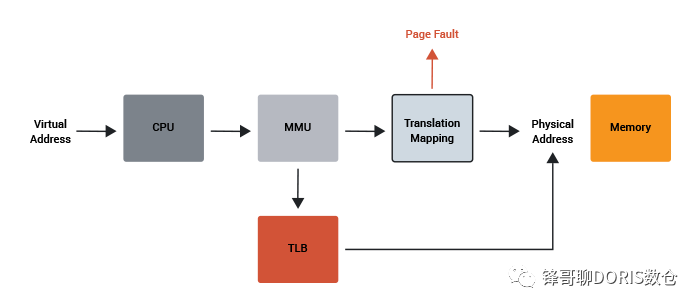 ,需要经过特别的CPU结构MMU进行虚拟地址到物理地址的映射。而MMU会到TLB(Translation lookaside buffer,记住这个是个缓存),查找对应的虚拟地址到物理地址的映射。由于操作系统中,内存都是通过页进行管理的,地址都是基于页内存地址的偏移量,所以这个过程变成了查找起始页地址的一个工作。如果目标虚存空间中的内存页,在物理内存中没有对应的页映射,那么这种情况下,就产生了缺页中断(Page Fault)。