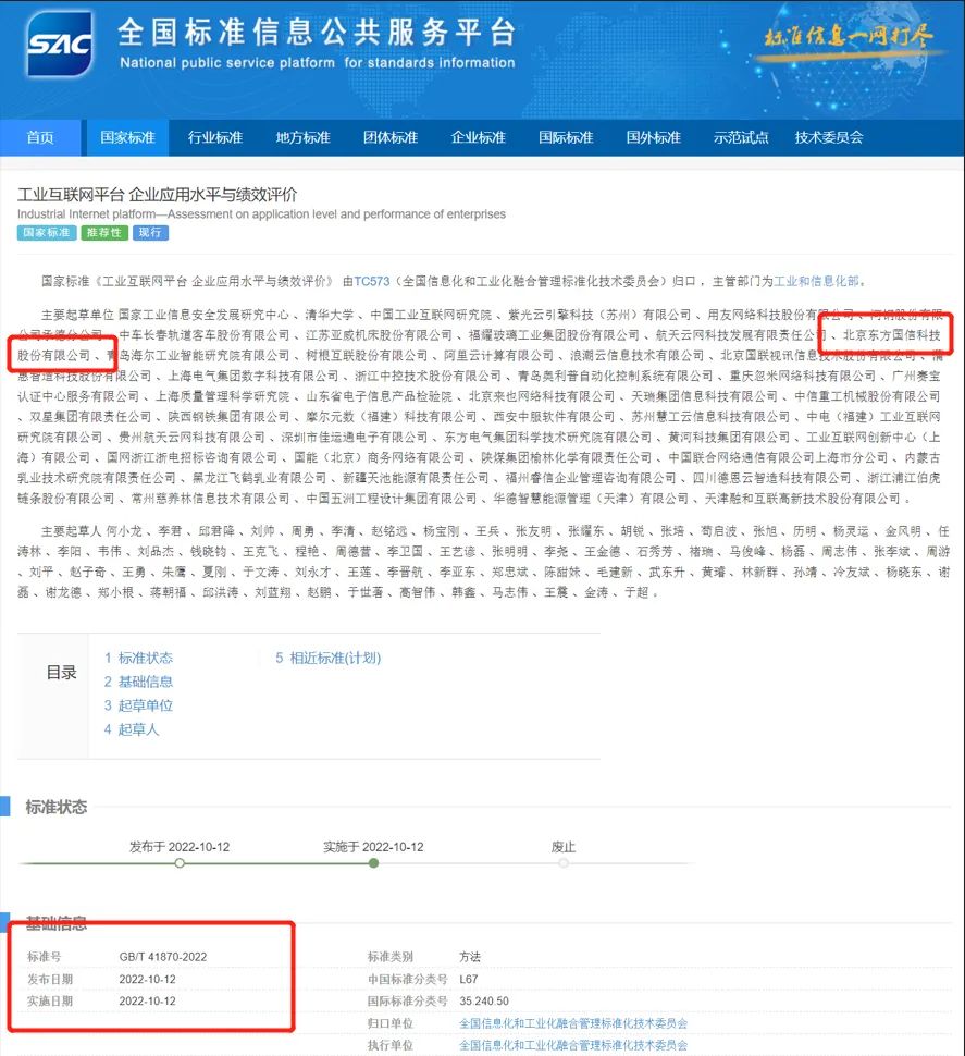 作为主要起草单位,北京东方国信科技股份有限公司全程参与了标准编制工作,同时结合自身工业互联网平台Cloudiip的特点以及丰富的案例实践经验,在标准涉及有关平台应用、业务创新、效能效益等诸多方面提出了建议和意见,圆满完成了标准相关条款的编制任务。