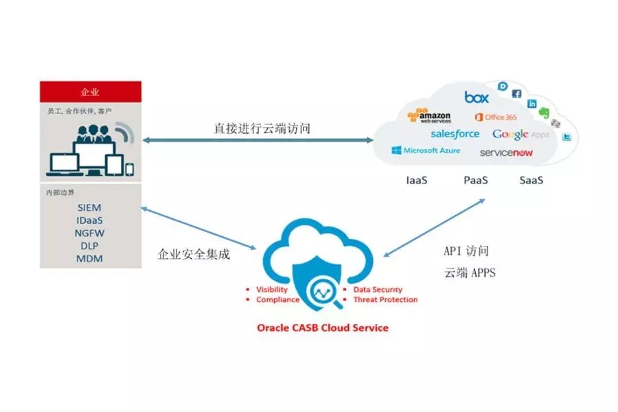 Oracle CASB位于云服务和服务的使用者之间,通过调用云服务提供商提供的API实现各种管理监控功能。另外它还可以同企业内部的SIEM, IDaaS, NGFW, DLP, MDM等系统集成。还可以上传内部网络设备的日志进行分析,发现Shadow IT。