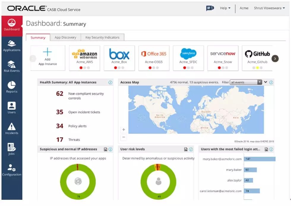 Oracle CASB提供图形化管理配置界面, 统一进行各种配置监控工作。同时,管理员对企业的云服务的使用情况有一个统一的视图,好比飞机驾驶舱的仪表盘,使管理员对企业的云服务安全了然于胸。