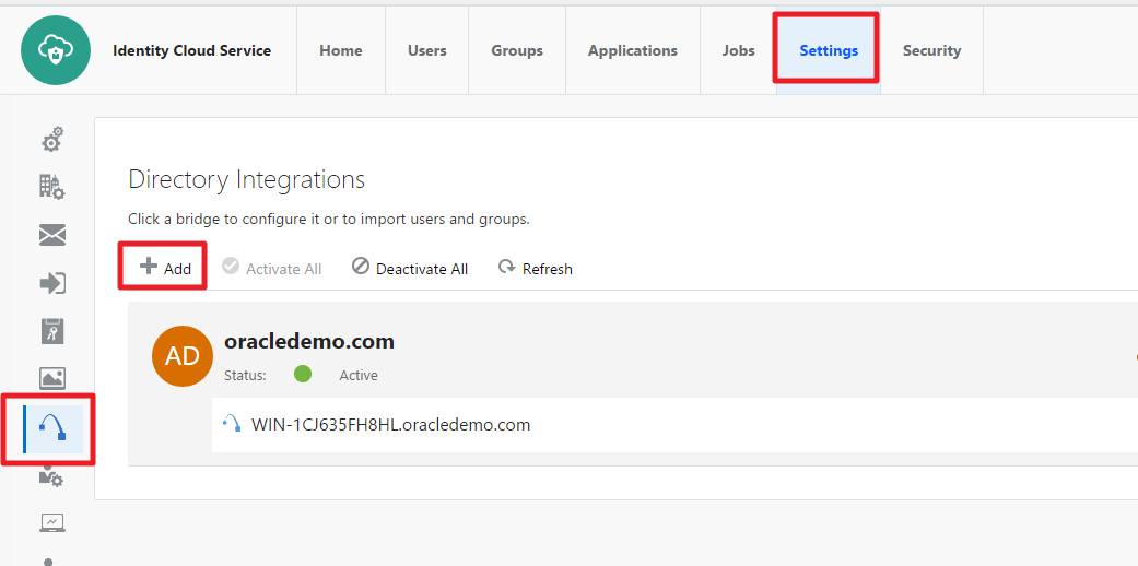 在IDCS 里 选择Settings -> Directory Integrations -> Add。