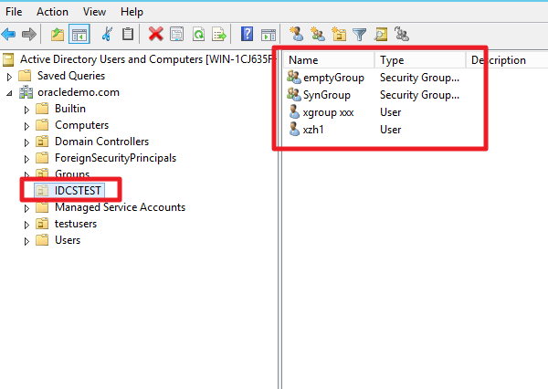 在Windows Server端,在需要同步的Organization Unit “IDCSTEST”下手动添加测试测试用户和组。