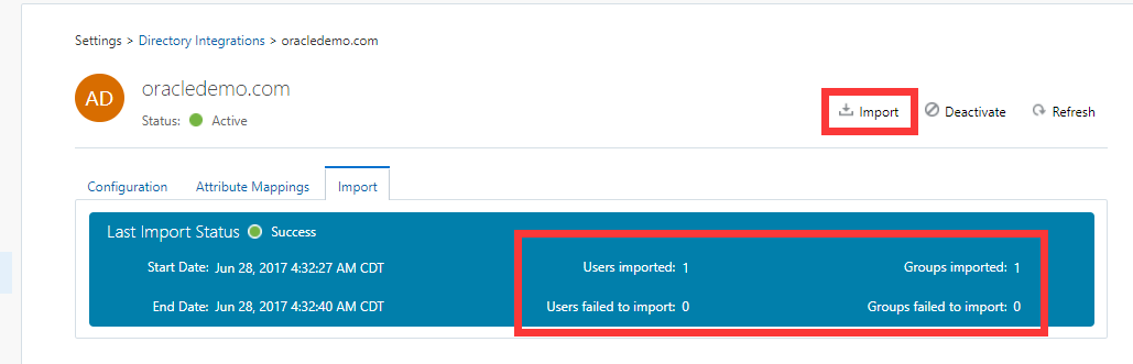 在IDCS端,执行导入用户和组操作,同时查看导入任务操作统计信息。