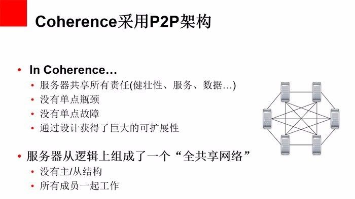Coherence是2001年发布的第一个版本, 2007 被Oracle 收购。到现在已经16年的历史,历经演进,目前最新的版本为12.2.1。Coherence可以说是最早的NoSql和分布式缓存产品。与开源的产品相比,coherence是他们的前辈,更成熟稳定可靠。Coherence采用独特的P2P架构,没有单点故障和单点瓶颈,可以线性扩展。