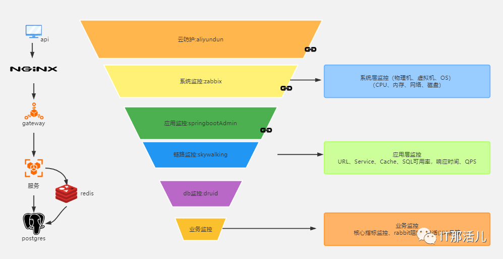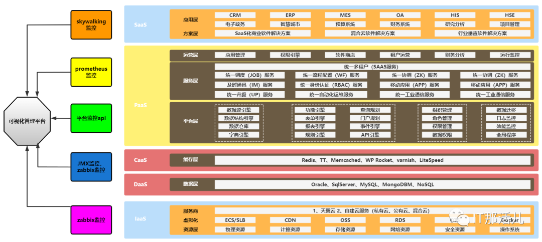 监控层级分为5层:IAAS,PAAS,SAAS,CAAS, DAASIAAS即基础设施层,包含服务器,存储,交换机,防火墙,WAF等一些硬件设备和相关网络;PAAS层指平台层,也叫中间层,主要负责提供各种开发和分发应用的解决方案,比如虚拟服务器和操作系统。如阿里云提供的虚拟机,数据库等;SAAS即应用层,直接提供服务的层级,比如百度,google,各种app等。最后两个是我的理解构想出来的,CAAS和DAAS 分别值的是缓存层,和数据层,即cache as a service 和 data as a service。在每一层,都有对应的监控agent以及数据处理服务,告警服务等,这些监控比较完善了,但是还存在一个问题,就是应用系统的各个监控项,并没有实时的串联起来,一旦应用系统出现业务故障,排查方法依然与以往一样,哪儿疼看哪儿。面对如今的云环境,去用传统的方法来做troubleshooting,如果面对大型综合类应用,简直如大海捞针,是不可取的。所以,我们需要一个新型的监控管理平台,能够从各个层面,系统的各个关键API,对系统自上而下的进行可视化监控。通过各个层级及接口的运行状态,效能数据,能够实时,准确的监控系统的健康状态。
