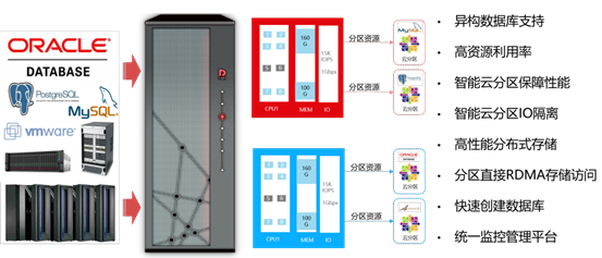 除此之外,PBData-K采用的独有分区技术,能够实现CPU核级隔离,内存预占。SR-IOV技术可实现分区直接存储访问,二者进一步结合高带宽低延时的InfiniBand 或 ROCE网络,能够最大限度地实现数据库的高性能和强稳定性。