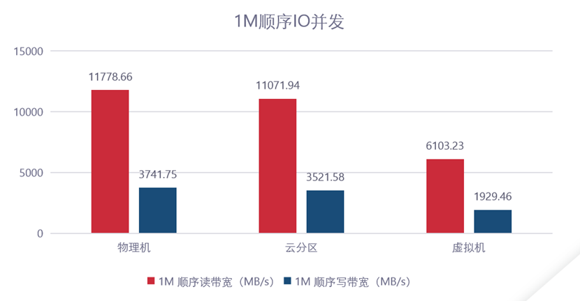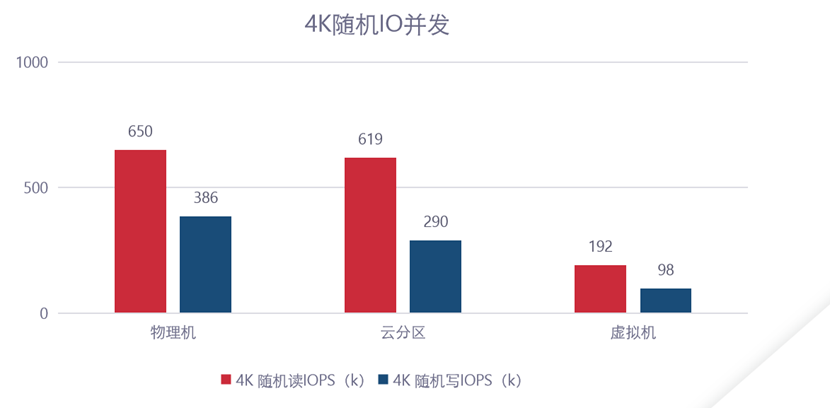 根据存储性能测试可以得出,在相同的配置下,物理机和PBData-K所提供的云分区在IO性能上,大块的顺序读写带宽相同,小块的随机读写IOPS差距不大,但前二者明显比KVM虚拟机要高出很多。