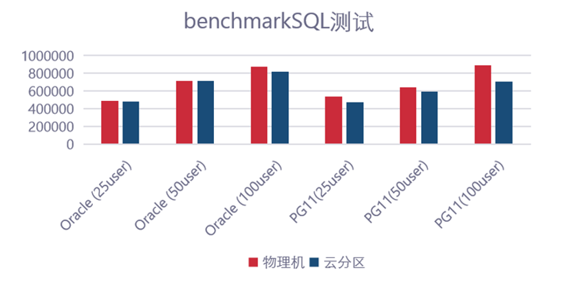从数据库性能测试结果中可以得出,在相同的配置下,物理机的数据库性能略高于云分区的数据库性能,二者之间的性能差距不大。