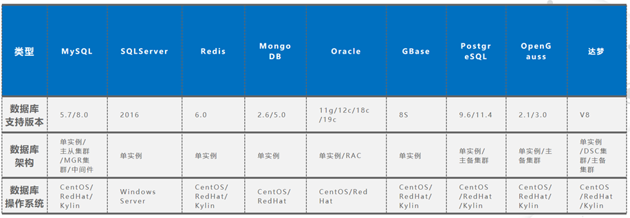 1 | 统一的数据库云平台——监控管理数据库私有云平台内的多类型数据库的监控管理及日常运维操作,有效降低运维人员的工作强度和运维技术难度。 |