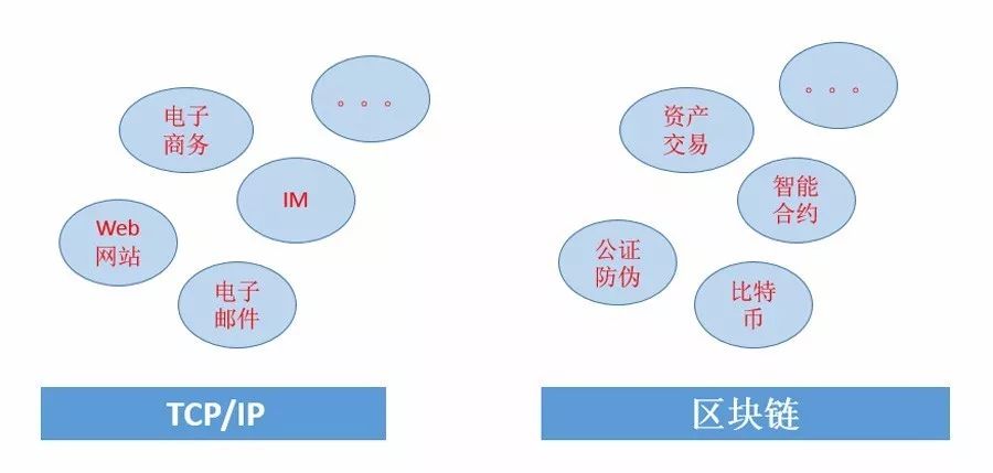 有人把区块链比做互联网,正如早期互联网的最早杀手级应用是电子邮件,比特币可以看成是区块链的第一个杀手级应用。互联网技术的底层技术基础是TCP/IP, 比特币等各种去中心化应用的底层技术基础是区块链。