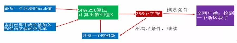 为鼓励大家参与维护比特币区块的创建,每个新增的区块中包含有一定数量的比特币,这些比特币归产生该区块的人所有。比特币协议规定:第0个 – 第21万个Block,每个Block里有50个比特币,第21万-第42万个Block,每个Block里有25个比特币,依次递减,通过数学计算得知最后比特币全网中只会有2100万个比特币. 如下图所示,节点尝试寻找一个随机数(又称“幸运数”),使得将最后一个区块的hash值、当前世界中尚未被加入到任何区块的交易单、随机数三部分组织起来送入SHA256算法计算出散列值X(256位),如果X满足一定条件(比如前20位均为0),那么该节点初步获得创建Block的权利。所以挖矿过程,就是不断寻找随机数的过程。通常需要反复尝试上亿次才能成功找到一个满足条件的随机数。