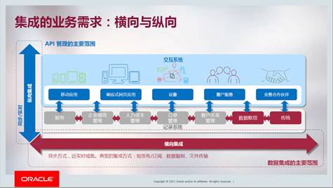 物联网是嵌入电子,软件,传感器,执行器和网络连接的物理对象或者“物”的网络,使这些对象能够收集和交换数据。甲骨文云转型总监范文曙认为,无论是在工业自动化、汽车和通讯、能源管理等行业,还是在金融服务和保险、零售、医疗健康等行业,物联网已经无处不在,而且正从效率、生产率、增长等方面重塑服务行业。作为万物互联的基础,Oracle提供数据集成平台云服务,以实现及时、准确、可靠和一致的数据收集和交换。集成包含横向和纵向2个维度的集成,横向集成是面向企业内部的业务系统之间的集成,通过OGG实现内部业务系统的实时数据汇聚、整合。纵向集成是面向企业与外部架构之间的集成,通过API网关开放KPI,实现内外部数据的互联互通。一言以蔽之:横向集成是编制,纵向集成是编排。