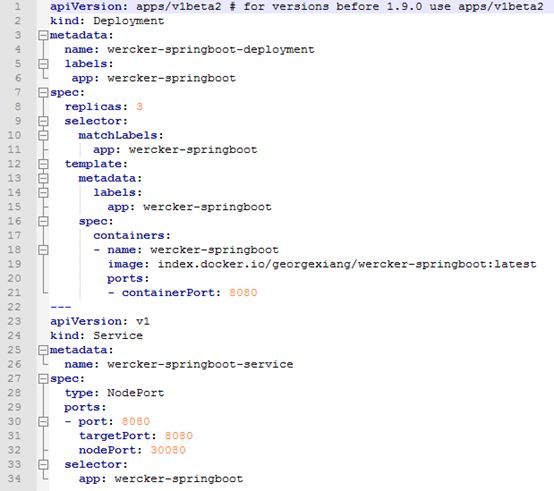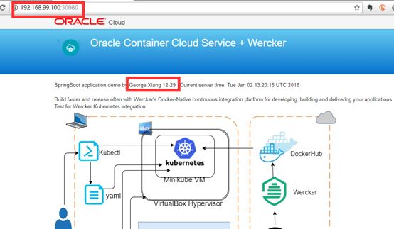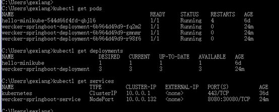 wercker-springboot.yaml配置文件包含两个component Deployment和Service,Deployment使用“index.docker.io/georgexiang/wercker-springboot”的镜像,容器副本(replicas)数目为3. Service 通过selector 选择相应的app ,暴露服务,使用30080端口,对外提供服务。运行命令: