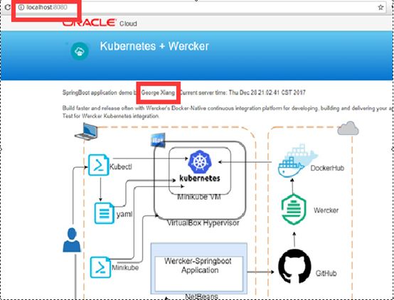 通过Kubernetes YAML文件将werker-springboot应用部署在本地Kubernetes 集群操作完成。至此,本系列文章展示了如何快速构建Kubernetes集群,通过Wercker将应用打包成Docker镜像,运行在Kubernetes集群上。