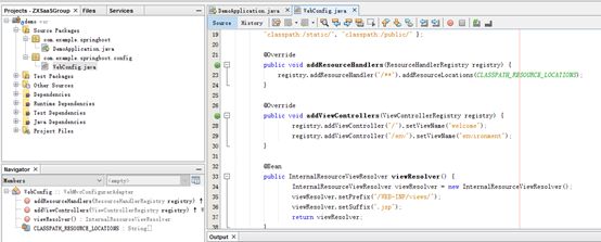 程序分为后端和前端,后端为使用springboot 类库编写的web 应用,响应”/”和”/env”的访问请求,将请求指向welcome.jsp 和environment.jsp资源