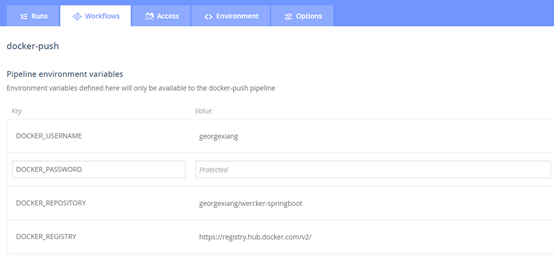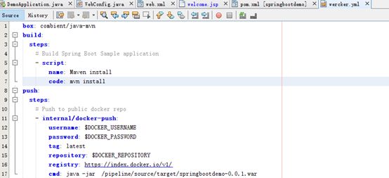 wercker.yml文件中,定义了box-指定使用的基础镜像,build和push两个pipeline。build pipeline包含一个step-script,运行mvn install的脚本。push pipeline里包含一个step-internal/docker-push,将镜像推到docker hub 镜像仓库里存储起来,inertnal-docker-push需要镜像仓库的登录信息,从系统变量里获取。wercker.yml不能直接在本地运行,需要在wercker.com平台上运行。