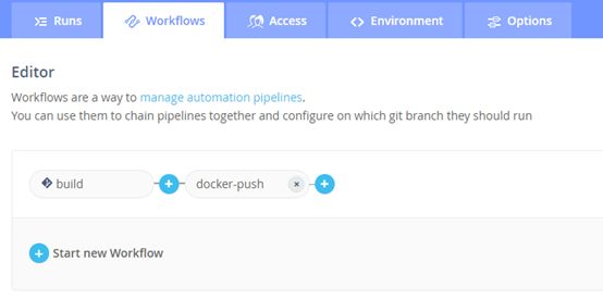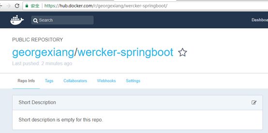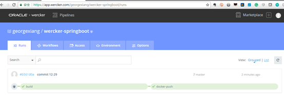 编辑workflow,在build pipeline 之后加入docker push pipeline ,形成一个完整的workflow,Wercker Application构建完成。Wercker Application 将build完成的wercker-springboot web 应用,打包成docker image,然后push到docker hub上,这个过程自动完成。