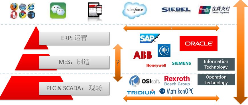 首先,董毅先生在演讲中指出,未来企业的竞争核心在于对信息资源的掌握,新的发展动能来自于市场关系的重构和生产过程的重构。对于后者的重构,恰恰是生产制造企业今天需要创造和捍卫的价值所在。在“过去未去、未来已来”的历史发展的转折时刻,企业不是要让渡自己的信息化能力和主权、颠覆自己的资产价值,而是要吸收和利用物联网技术充分为自己“赋能”。如何为企业“赋能”,接下来董毅先生表示,首先要打通IT(Information Technology)技术和OT(Operation Technology)技术的鸿沟。