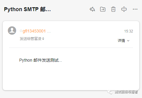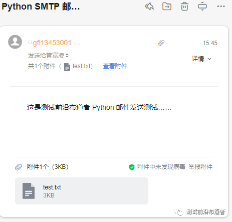 message.attach(MIMEText('这是测试前沿布道者 Python 邮件发送测试……', 'plain', 'utf-8'))