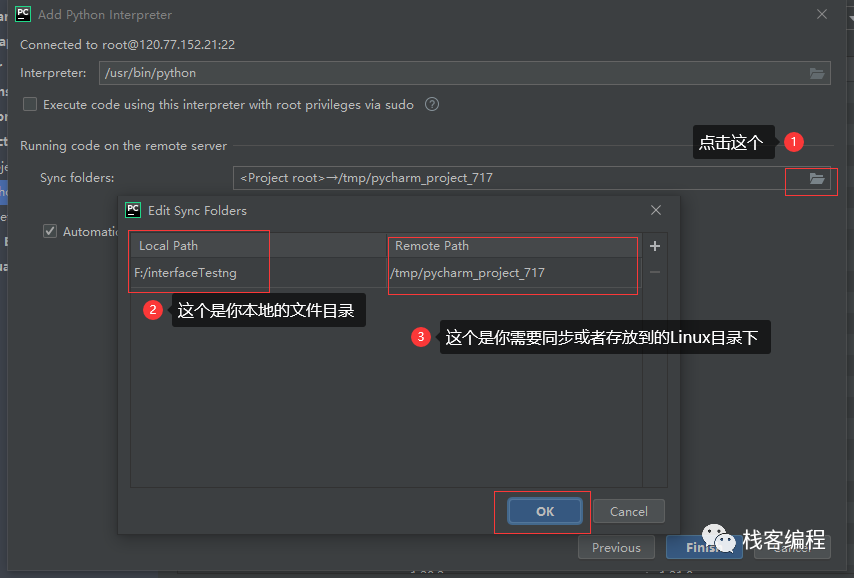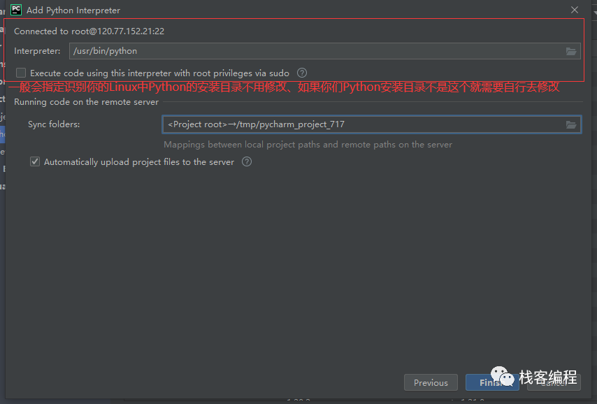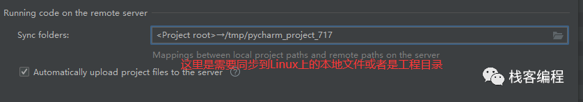 Sync folders 这里是指你本地的工程目录或者文件需要上传到Linux的哪个目录下、默认是在/tmp/pycharm_project_717 目录下