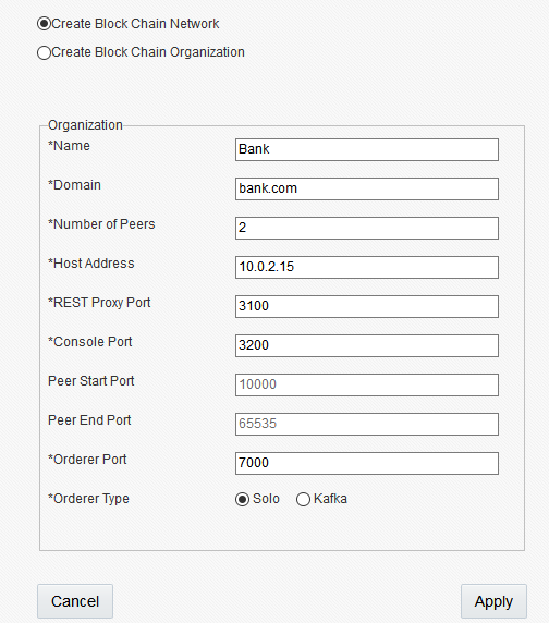 如下图所示:首先创建三方共同参与的区块链网络,甲骨文区块链云服务提供的配置页面简单易用,仅需配置几个参数如:区块链组织名称、共识算法类型、节点数、控制台端口,链码服务代理端口等即可完成区块链服务网络的创建和部署。对于联盟组织商,选择“创建块链网络”单选按钮。然后配置如下图: