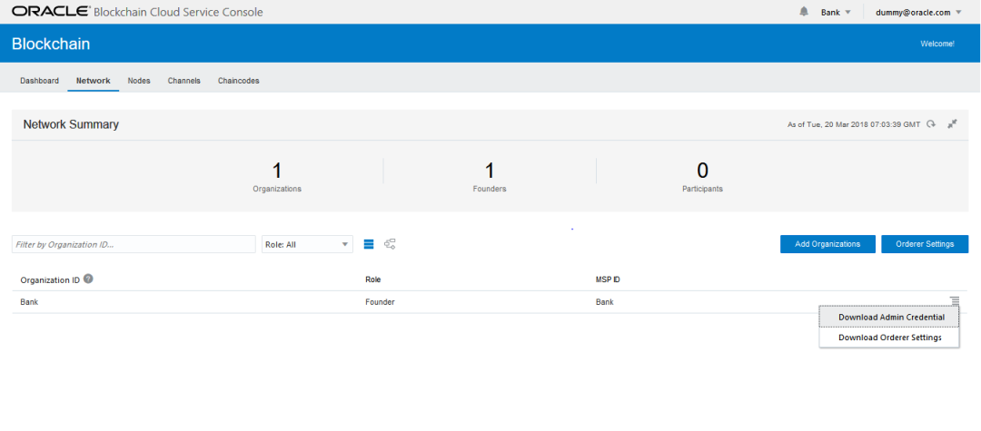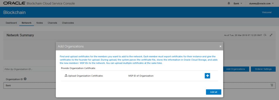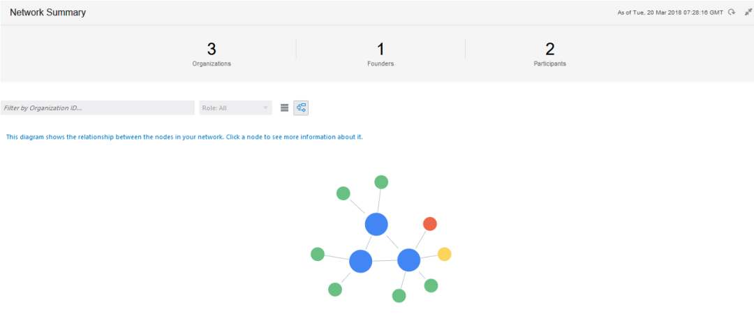 甲骨文区块链云服务提供联盟链的管理方式,每个联盟成员独立管理自己的节点和账本;点击不同的参与者组织,可以进入各个加盟商的独立区块链管理界面,每个组织管理员可以进入管理控制台进行各自区块链系统的部署,管理,运维等工作,实时查看区块链服务里节点的类型、数量和状态,方便管理员实时了解每个区块链服务的状况。