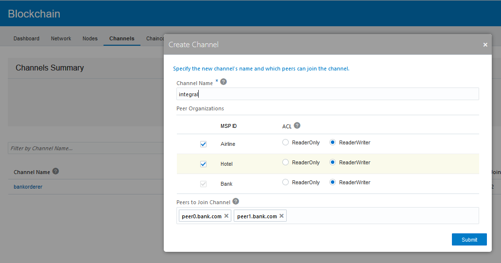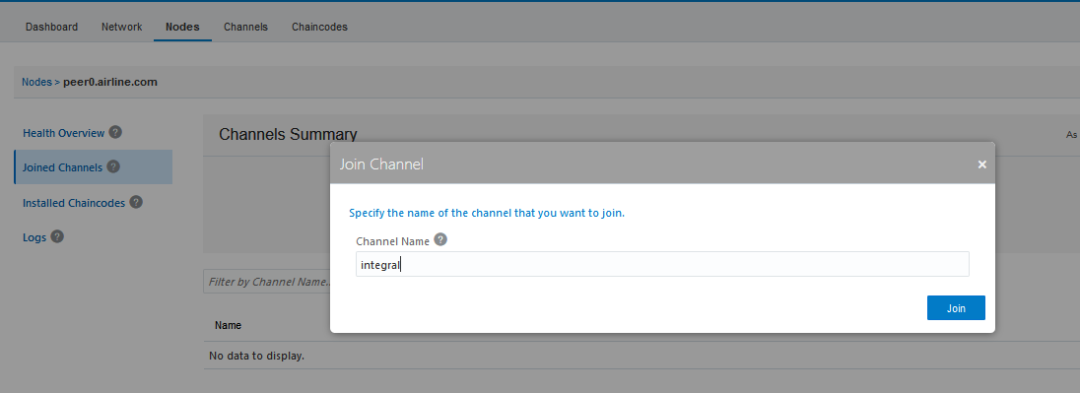 目前为止,新创建的通道只包含组织商(A银行)的对等节点。其他加盟商还不能在这些通道上创建事务,也不能查看这些通道上的事务,因为它们还没有节点加入通道中。为了加入创建的通道,请访问参与者组织的控制台。从那里导航到“节点”选项卡,单击要添加到通道的对等点的名称并加入通道。