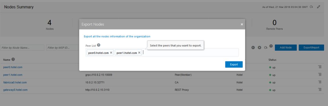为了让组织者知道其他加盟商的对等节点信息,我们必须先导出节点信息,并将其导入组织商节点信息。在加盟商管理控制台中,导航到“节点”选项卡,然后单击“导出/导入”按钮导出节点信息。选择加盟商的两个对等点,然后单击“导出”并保存结果文件。