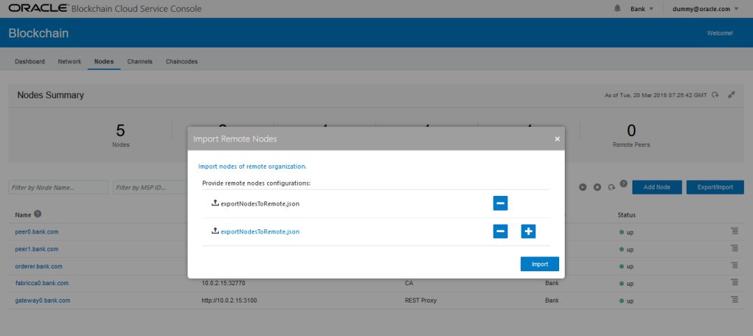在节点信息被导出后,在组织商控制台中,导航到“节点”选项卡,点击“导出/导入”按钮,导入节点信息。