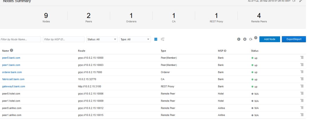 在完成上述操作步骤后,其他加盟组织的对等节点的信息会出现在节点列表中,节点与MSP ID列中的组织关联,MSP(会员服务提供商,负责跟踪参与网络的组织)。