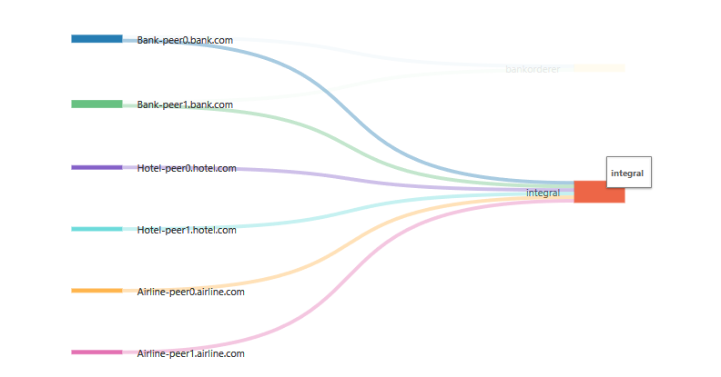 到目前为止,我们已经建立好一个积分联盟完整的区块链网络,可以从区块链联盟组织者控制台导航到“节点”选项卡,点击“浏览拓扑”,见下图网络拓扑所示,联盟组织者(A银行)以及两个加盟商(B航空公司,C酒店联盟)的所有对等节点都加入到了一个通道中。